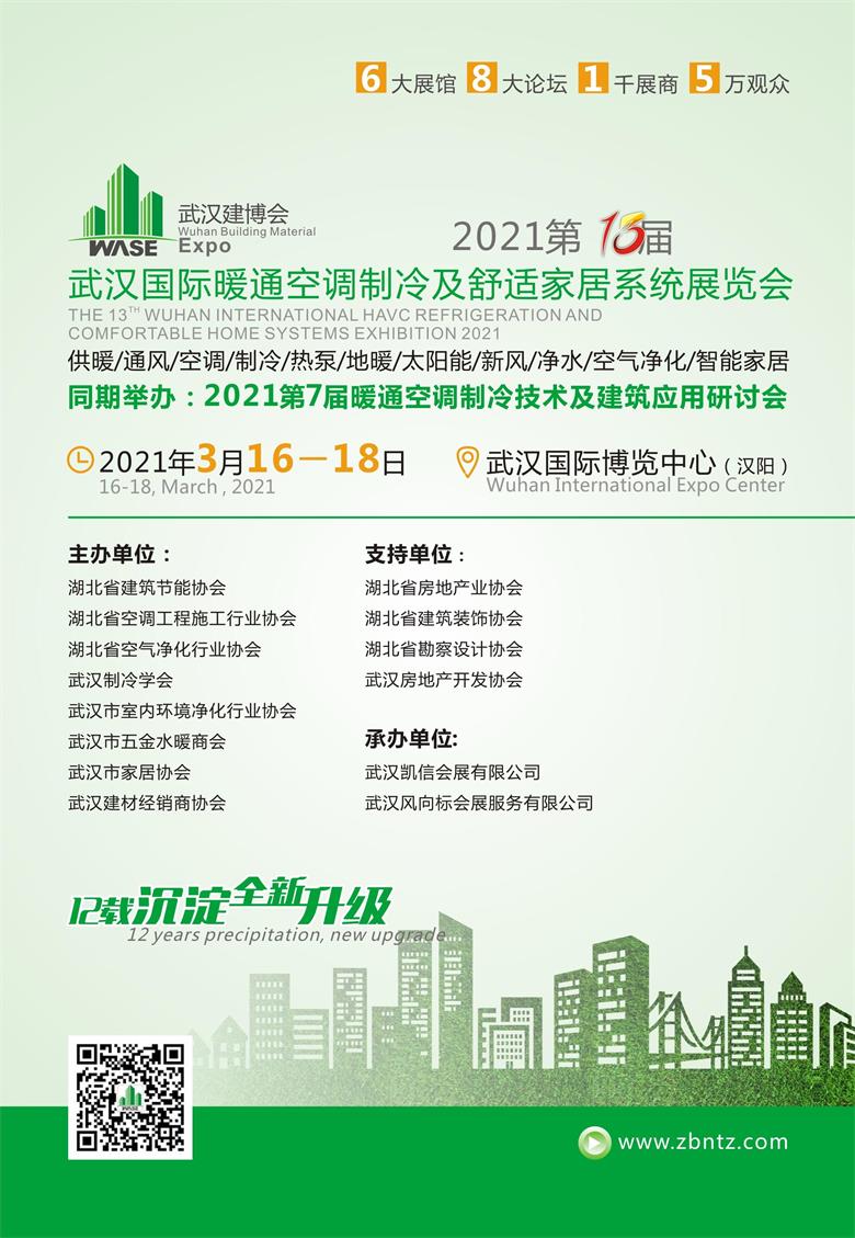 • 2021第13屆武漢國際暖通空調制冷及舒適家居系統展覽會202113thwuhaninternationalhavcrefrigerationandcomfortablehomesystemsexhibition供暖/通風/空調/制冷/熱泵/地暖/太陽能/新風/凈水/空氣凈化/智能家居同期舉辦:2021第7屆暖通空調制冷技術及建筑應用研討會時間:2021年3月16-18日地點:武漢國際博覽中心(漢...